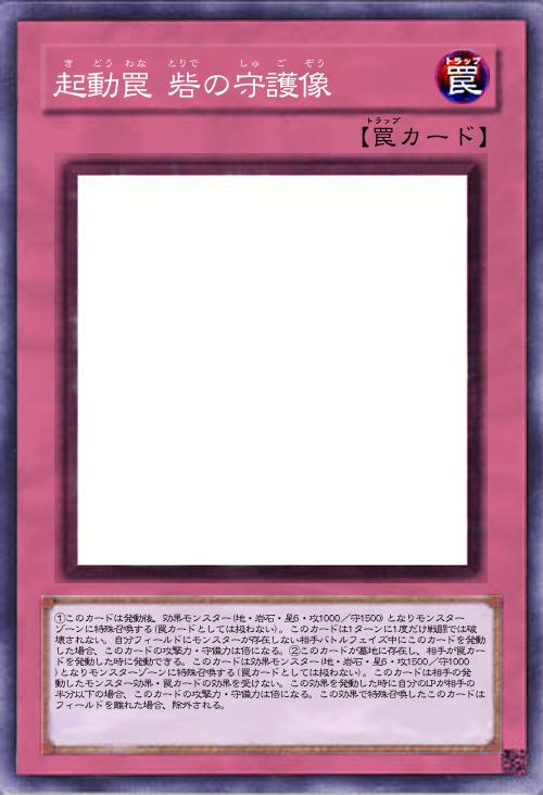 | ①このカードは発動後、効果モンスター(地・岩石・星6・攻1000/守1500)となりモンスターゾーンに特殊召喚する(罠カードとしては扱わない)。このカードは1ターンに1度だけ戦闘では破壊されない。自分フィールドにモンスターが存在しない相手バトルフェイズ中にこのカードを発動した場合、このカードの攻撃力・守備力は倍になる。②このカードが墓地に存在し、相手が罠カードを発動した時に発動できる。このカードは効果モンスター(地・岩石・星6・攻1500/守1000)となりモンスターゾーンに特殊召喚する(罠カードとしては扱わない)。このカードは相手の発動したモンスター効果・罠カードの効果を受けない。この効果を発動した時に自分のLPが相手の半分以下の場合、このカードの攻撃力・守備力は倍になる。この効果で特殊召喚したこのカードはフィールドを離れた場合、除外される。 | |||