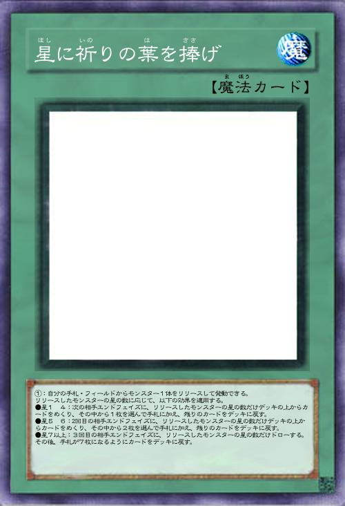 | ①:自分の手札・フィールドからモンスター1体をリリースして発動できる。 リリースしたモンスターの星の数に応じて、以下の効果を適用する。 ●星1〜4:次の相手エンドフェイズに、リリースしたモンスターの星の数だけデッキの上からカードをめくり、その中から1枚を選んで手札に加え、残りのカードをデッキに戻す。 ●星5〜6:2回目の相手エンドフェイズに、リリースしたモンスターの星の数だけデッキの上からカードをめくり、その中から2枚を選んで手札に加え、残りのカードをデッキに戻す。 ●星7以上:3回目の相手エンドフェイズに、リリースしたモンスターの星の数だけドローする。その後、手札が7枚になるようにカードをデッキに戻す。 | |||