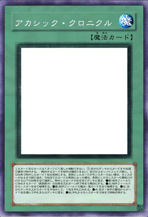 | このカード名のカードは1ターンに1度しか発動できない。①:自分のデッキからカードを6枚選び裏側で除外する。(除外するカードを相手は確認できない)自分のスタンバイフェイズ毎に、この効果で除外したカード1枚を表側にする。表側にしたカードがモンスターでない場合、モンスターが出るまで繰り返す。6枚全てのカードが表側になった場合、表側にしたモンスターの属性に対応する以下の効果を全て適用し、除外したカード6枚を全てデッキに戻す。●闇:相手フィールドに存在するカード(表側表示)の効果を次のターン終了時まで無効にする。●炎:相手フィールドのモンスターを全て破壊する。●風:相手フィールドの魔法・罠カードを全て破壊する。●光:自分のデッキの上からカードを6枚めくり、1枚を手札に加える。●水:自分・相手の墓地からカード1枚を選んで手札またはデッキに戻す。●地:手札からモンスターを3体まで特殊召喚する。 | |||