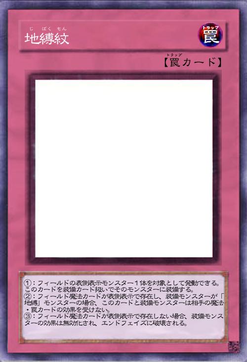 | ①:フィールドの表側表示モンスター1体を対象として発動できる。 このカードを装備カード扱いでそのモンスターに装備する。 ②:フィールド魔法カードが表側表示で存在し、装備モンスターが「地縛」モンスターの場合、このカードと装備モンスターは相手の魔法・罠カードの効果を受けない。 ③:フィールド魔法カードが表側表示で存在しない場合、装備モンスターの効果は無効化され、エンドフェイズに破壊される。 | |||