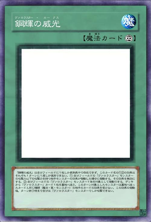 | 「鋼輝の威光」は自分フィールドに1枚しか表側表示で存在できず、このカード名の①②の効果はそれぞれ1ターンに1度しか使用できない。①:自分フィールドの「ヴァロラスター」モンスターの攻撃力以下の攻撃力を持つ相手モンスターの効果が発動した場合に発動する。その効果を無効にする。②:自分フィールドの「ヴァロラスター」モンスター1体を対象として発動できる。デッキから「ヴァロラスター」カード1枚を墓地へ送り、このターン対象としたモンスターは墓地へ送ったカードと同じ種類(魔法・罠・モンスター)の相手のカードの効果を受けない。この効果の発動後、ターン終了時まで自分は「ヴァロラスター」モンスターでしか攻撃できない。 | |||