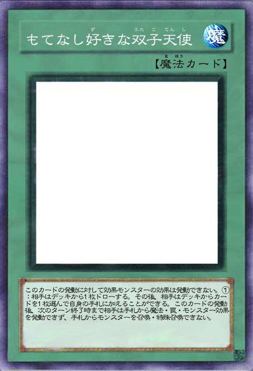 | このカードの発動に対して効果モンスターの効果は発動できない。①:相手はデッキから1枚ドローする。その後、相手はデッキからカードを1枚選んで自身の手札に加えることができる。このカードの発動後、次のターン終了時まで相手は手札から魔法・罠・モンスター効果を発動できず、手札からモンスターを召喚・特殊召喚できない。 | |||