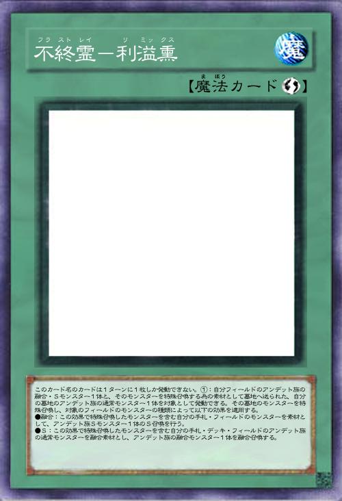 | このカード名のカードは1ターンに1枚しか発動できない。①:自分フィールドのアンデット族の融合・Sモンスター1体と、そのモンスターを特殊召喚する為の素材として墓地へ送られた、自分の墓地のアンデット族の通常モンスター1体を対象として発動できる。その墓地のモンスターを特殊召喚し、対象のフィールドのモンスターの種類によって以下の効果を適用する。 ●融合:この効果で特殊召喚したモンスターを含む自分の手札・フィールドのモンスターを素材として、アンデット族Sモンスター1体のS召喚を行う。 ●S:この効果で特殊召喚したモンスターを含む自分の手札・デッキ・フィールドのアンデット族の通常モンスターを融合素材とし、アンデット族の融合モンスター1体を融合召喚する。 | |||
