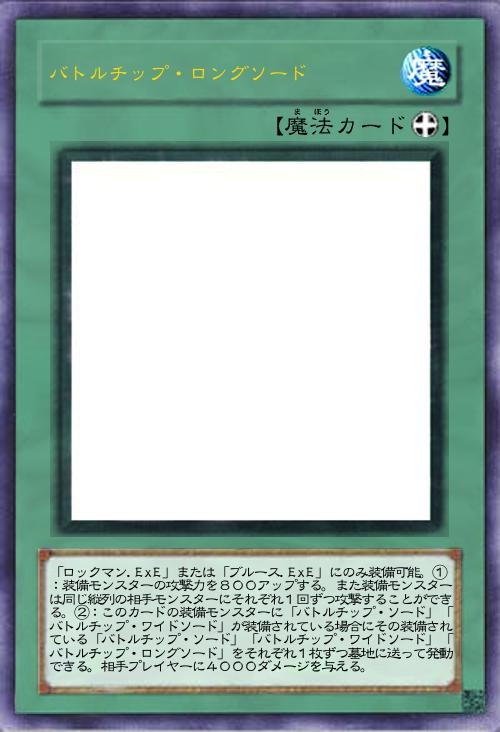| 「ロックマン.ExE」または「ブルース.ExE」にのみ装備可能。①:装備モンスターの攻撃力を800アップする。また装備モンスターは同じ縦列の相手モンスターにそれぞれ1回ずつ攻撃することができる。②:このカードの装備モンスターに「バトルチップ・ソード」「バトルチップ・ワイドソード」が装備されている場合にその装備されている「バトルチップ・ソード」「バトルチップ・ワイドソード」「バトルチップ・ロングソード」をそれぞれ1枚ずつ墓地に送って発動できる。相手プレイヤーに4000ダメージを与える。 | |||