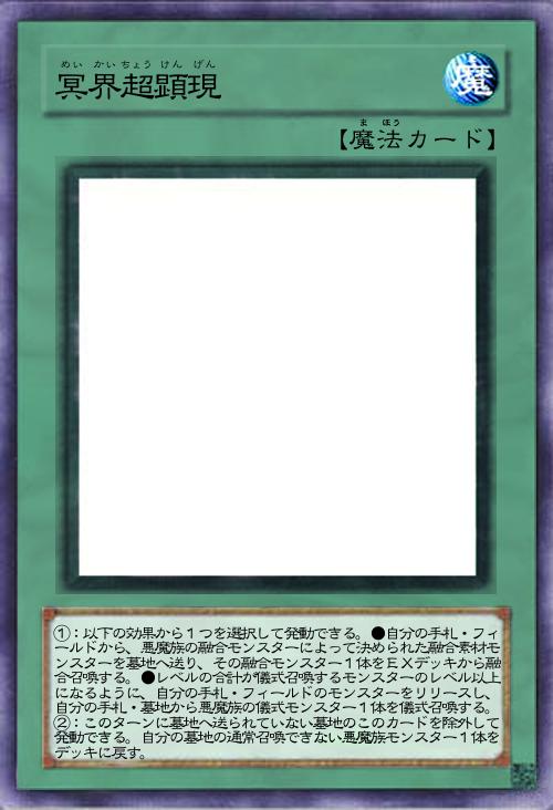 | ①:以下の効果から1つを選択して発動できる。●自分の手札・フィールドから、悪魔族の融合モンスターによって決められた融合素材モンスターを墓地へ送り、その融合モンスター1体をEXデッキから融合召喚する。●レベルの合計が儀式召喚するモンスターのレベル以上になるように、自分の手札・フィールドのモンスターをリリースし、自分の手札・墓地から悪魔族の儀式モンスター1体を儀式召喚する。②:このターンに墓地へ送られていない墓地のこのカードを除外して発動できる。自分の墓地の通常召喚できない悪魔族モンスター1体をデッキに戻す。 | |||