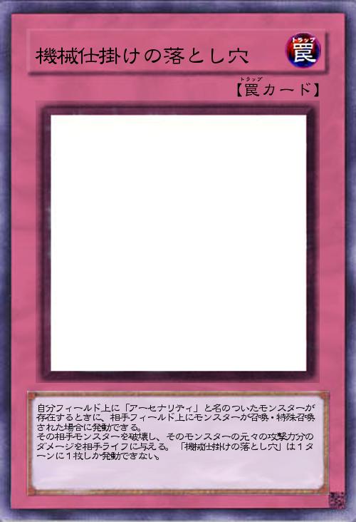 自分フィールド上に「アーセナリティ」と名のついたモンスターが存在するときに、相手フィールド上にモンスターが召喚・特殊召喚された場合に発動できる。 その相手モンスターを破壊し、そのモンスターの元々の攻撃力分のダメージを相手ライフに与える。「機械仕掛けの落とし穴」は1ターンに1枚しか発動できない。 |