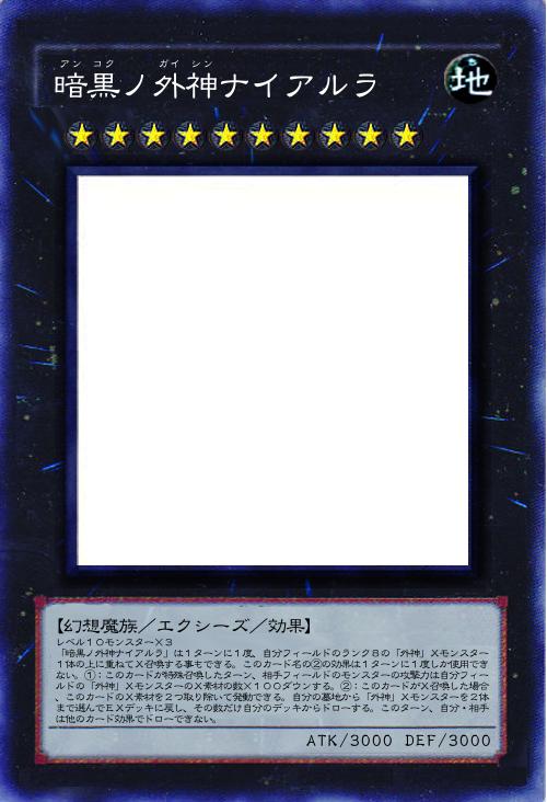 | レベル10モンスター×3 「暗黒ノ外神ナイアルラ」は1ターンに1度、自分フィールドのランク8の「外神」Xモンスター1体の上に重ねてX召喚する事もできる。このカード名の②の効果は1ターンに1度しか使用できない。①:このカードが特殊召喚したターン、相手フィールドのモンスターの攻撃力は自分フィールドの「外神」ⅩモンスターのⅩ素材の数×100ダウンする。②:このカードがⅩ召喚した場合、このカードのⅩ素材を2つ取り除いて発動できる。自分の墓地から「外神」Ⅹモンスターを2体まで選んでEXデッキに戻し、その数だけ自分のデッキからドローする。このターン、自分・相手は他のカード効果でドローできない。 | |||