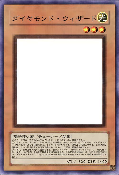 | このカード名の①②の効果はそれぞれ1ターンに1度ずつしか使用できない。 ①:自分フィールドにモンスターが存在しない場合、手札・デッキから「ダイヤモンド・ドラゴン」1体を墓地へ送って発動できる。このカードを自分の手札・墓地から特殊召喚する。この効果の発動後、ターン終了時まで自分は光属性モンスターしか召喚・特殊召喚できない。 ②:手札2枚を墓地へ送って発動できる。自分フィールドに「ダイヤモンドトークン」(岩石族・光・星1・攻/守0)2体を守備表示で特殊召喚する。この効果の発動後、ターン終了時まで自分は「ダイヤモンド・ドラゴン」またはそのカード名が記されたモンスターしか召喚・特殊召喚できない。 | |||
