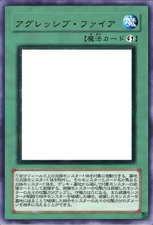 | ①自分フィールド上の炎族モンスター1体を対象に発動できる。墓地の炎族モンスター1体を除外し、そのモンスターとカード名が異なる炎族モンスター1体を、デッキ・墓地から選んで対象モンスターの装備カードとして装備する。装備モンスターの攻撃力は装備したモンスターの元々の攻撃力分アップし、守備力は0になる。また装備モンスターが戦闘で相手モンスターを破壊した場合、装備したモンスターを墓地に送ることで破壊した相手モンスターの元々の攻撃力分のダメージを相手に与えることができる。 | |||