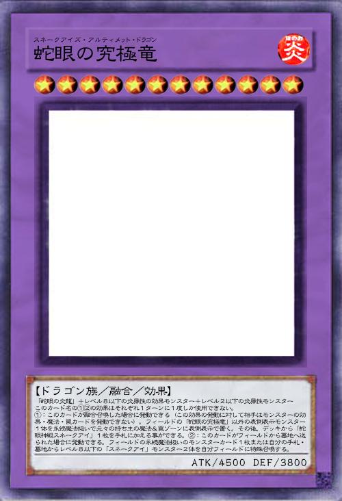 | 「蛇眼の炎龍」+レベル8以下の炎属性の効果モンスター+レベル2以下の炎属性モンスター このカード名の①②の効果はそれぞれ1ターンに1度しか使用できない。 ①:このカードが融合召喚した場合に発動できる(この効果の発動に対して相手はモンスターの効果・魔法・罠カードを発動できない)。フィールドの「蛇眼の究極竜」以外の表側表示モンスター1体を永続魔法扱いで元々の持ち主の魔法&罠ゾーンに表側表示で置く。その後、デッキから「蛇眼神殿スネークアイ」1枚を手札に加える事ができる。②:このカードがフィールドから墓地へ送られた場合に発動できる。フィールドの永続魔法扱いのモンスターカード1枚または自分の手札・墓地からレベル8以下の「スネークアイ」モンスター2体を自分フィールドに特殊召喚する。 | |||