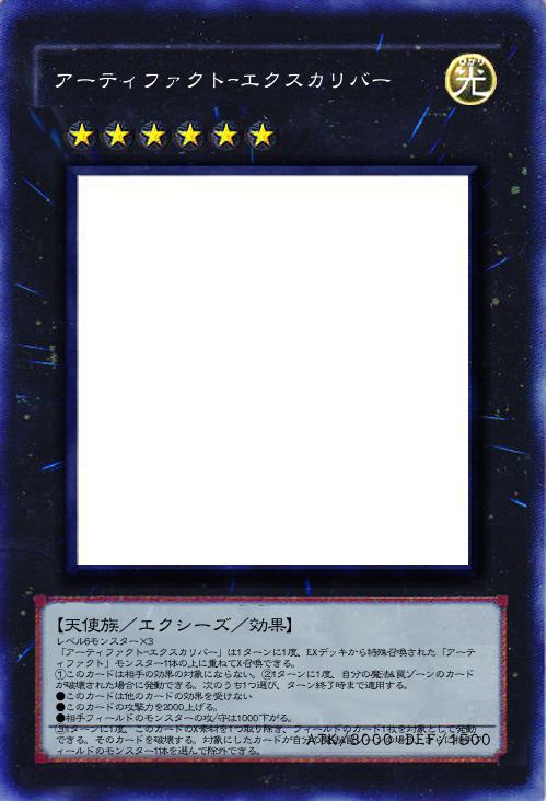 | レベル6モンスター×3 「アーティファクトーエクスカリバー」は1ターンに1度、EXデッキから特殊召喚された「アーティファクト」モンスター1体の上に重ねてX召喚できる。 ①このカードは相手の効果の対象にならない。②1ターンに1度、自分の魔法&罠ゾーンのカードが破壊された場合に発動できる。次のうち1つ選び、ターン終了時まで適用する。 ●このカードは他のカードの効果を受けない ●このカードの攻撃力を2000上げる。 ●相手フィールドのモンスターの攻/守は1000下がる。 ③1ターンに1度、このカードのX素材を1つ取り除き、フィールドのカード1枚を対象として発動できる。そのカードを破壊する。対象にしたカードが自分の魔法&罠ゾーンの場合、さらに相手フィールドのモンスター1体を選んで除外できる。 | |||