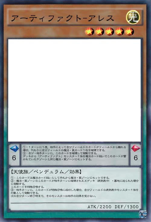 | ①:1ターンに1度、相手によって自分フィールドのカードがフィールドから離れる場合、代わりに自分フィールドの魔法・罠カード1枚を破壊できる。 ②:自分・相手ターンに、このカードを破壊して発動できる。 デッキから「アーティファクト」モンスター1体を魔法カード扱いでこのカードが置かれていたPゾーンと同じ魔法・罠ゾーンにセットする。 | |||