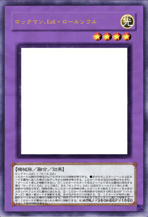 | ロックマン.ExE」+「ロール.ExE」 このカードは融合召喚及び以下の方法でのみ特殊召喚できる。●自分のモンスターゾーンの上記カードを墓地へ送った場合にEXデッキから特殊召喚できる。このカード名の③④の効果はそれぞれ1ターンに1度しか発動できない。①:このカードのカード名はフィールドまたは墓地に存在する場合「ロックマン.ExE」として扱う。また「ロックマン.ExE」は自分フィールドに1体しか表側表示で存在できず、特殊召喚したこのカードは特殊召喚したターンから数えて3ターン目の自分スタンバイフェイズに墓地に送られる。②:このカードが表側表示で存在する限り自分が「バトルチップ」魔法・罠カードを発動する度、自分のLPを500回復する。③:このカードが相手に戦闘ダメージを与えた場合に発動できる。相手プレイヤーの手札を1枚ランダムに選んで破壊する。④:このカードが墓地に送られた場合に発動できる。自分の手札・デッキ・墓地から「ロックマン.ExE」1体を特殊召喚する。 | |||