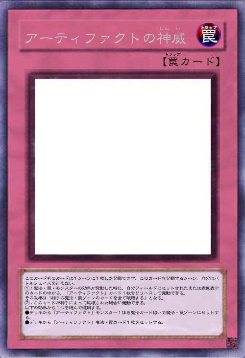 | このカード名のカードは1ターンに1枚しか発動できず、このカードを発動するターン、自分はバトルフェイズを行えない。 ①:魔法・罠・モンスターの効果が発動した時に、自分フィールドにセットされたまたは表側表示のカードの中から、「アーティファクト」カード1枚をリリースして発動できる。 その効果は「相手の魔法・罠ゾーンのカードを全て破壊する」となる。 ②:このカードが相手によって破壊された場合に発動できる。 以下の効果から1つを選んで適用する。 ●デッキから「アーティファクト」モンスター1体を魔法カード扱いで魔法・罠ゾーンにセットする。 ●デッキから「アーティファクト」魔法・罠カード1枚をセットする。 | |||