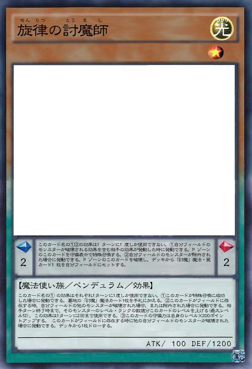 | このカード名の①②の効果は1ターンに1度しか使用できない。①自分フィールドのモンスターが破壊される効果を含む相手の効果が発動した時に発動できる。Pゾーンのこのカードを守備表示で特殊召喚する。②自分フィールドのモンスターが除外された場合に発動できる。Pゾーンのこのカードを破壊し、デッキから「討魔」魔法・罠カード1枚を自分フィールドにセットする。 | |||