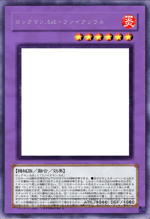 | ロックマン.ExE」+「ファイアマン.ExE」 このカードは融合召喚及び以下の方法でのみ特殊召喚できる。●自分のモンスターゾーンの上記カードを墓地へ送った場合にEXデッキから特殊召喚できる。このカード名の②④の効果はそれぞれ1ターンに1度しか発動できない。①:このカードのカード名はフィールドまたは墓地に存在する場合「ロックマン.ExE」として扱う。また「ロックマン.ExE」は自分フィールドに1体しか表側表示で存在できず、特殊召喚したこのカードは特殊召喚したターンから数えて3ターン目の自分スタンバイフェイズに墓地に送られる。②:このカードが特殊召喚に成功した場合に発動できる。デッキから「草原」1枚を選んで自分のフィールドゾーンに表側表示で置く。③:自分のフィールドゾーンに「草原」が存在する限りこのカードが相手に与える戦闘ダメージは倍になる。またこのカードが風属性モンスターと戦闘を行う場合そのダメージステップ終了時までこのカードの攻撃力は倍になる。④:このカードが墓地に送られた場合に発動できる。自分の手札・デッキ・墓地から「ロックマン.ExE」1体を特殊召喚する。 | |||