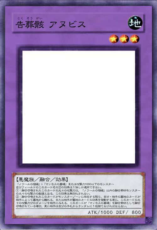 | 「ノワールの宿縁」+「マンモスの墓場」または攻撃力1000以下のモンスター 自分フィールドのこのカード名の②の効果は1体しか適用できない。 ①:融合召喚されたこのカードの元々の攻撃力は、「ノワールの宿縁」以外の融合素材モンスターの元々の攻撃力の数値となる。この効果は無効化されない。 ②:融合召喚されたこのカードがモンスターゾーンに存在する限り、自分・相手の墓地のカードが相手によって墓地から離れる、または相手が墓地のカードの効果を発動する度に、このカードの元々の攻撃力分のダメージを相手に与える。このカードが「マンモスの墓場」を融合素材として融合召喚されている場合、更に相手は自分の手札からランダムに1枚捨てなければならない。 | |||