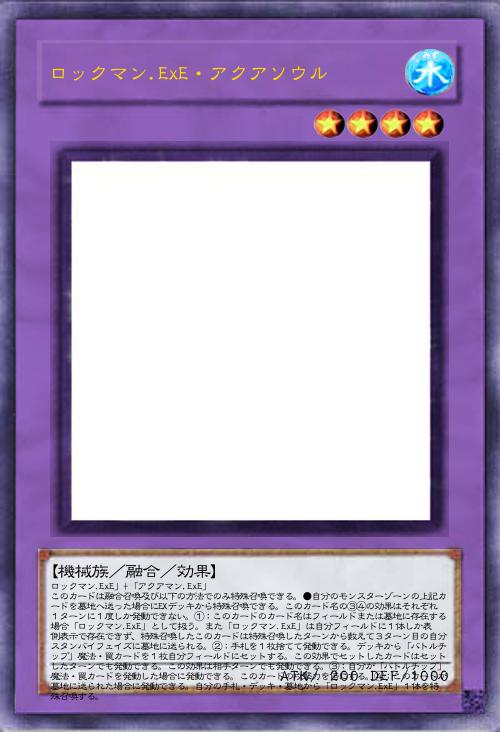 | ロックマン.ExE」+「アクアマン.ExE」 このカードは融合召喚及び以下の方法でのみ特殊召喚できる。●自分のモンスターゾーンの上記カードを墓地へ送った場合にEXデッキから特殊召喚できる。このカード名の③④の効果はそれぞれ1ターンに1度しか発動できない。①:このカードのカード名はフィールドまたは墓地に存在する場合「ロックマン.ExE」として扱う。また「ロックマン.ExE」は自分フィールドに1体しか表側表示で存在できず、特殊召喚したこのカードは特殊召喚したターンから数えて3ターン目の自分スタンバイフェイズに墓地に送られる。②:手札を1枚捨てて発動できる。デッキから「バトルチップ」魔法・罠カードを1枚自分フィールドにセットする。この効果でセットしたカードはセットしたターンでも発動できる。この効果は相手ターンでも発動できる。③:自分が「バトルチップ」魔法・罠カードを発動した場合に発動できる。このカードの攻撃力を倍にする。④:このカードが墓地に送られた場合に発動できる。自分の手札・デッキ・墓地から「ロックマン.ExE」1体を特殊召喚する。 | |||