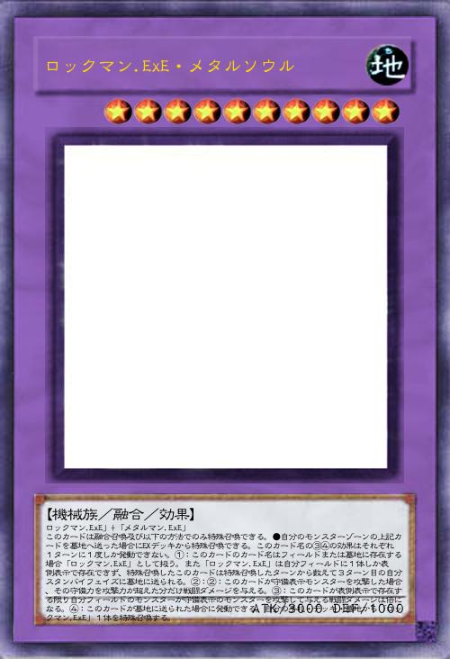 | ロックマン.ExE」+「メタルマン.ExE」 このカードは融合召喚及び以下の方法でのみ特殊召喚できる。●自分のモンスターゾーンの上記カードを墓地へ送った場合にEXデッキから特殊召喚できる。このカード名の③④の効果はそれぞれ1ターンに1度しか発動できない。①:このカードのカード名はフィールドまたは墓地に存在する場合「ロックマン.ExE」として扱う。また「ロックマン.ExE」は自分フィールドに1体しか表側表示で存在できず、特殊召喚したこのカードは特殊召喚したターンから数えて3ターン目の自分スタンバイフェイズに墓地に送られる。②:②:このカードが守備表示モンスターを攻撃した場合、その守備力を攻撃力が超えた分だけ戦闘ダメージを与える。③:このカードが表側表示で存在する限り自分フィールドのモンスターが守備表示のモンスターを攻撃して与える戦闘ダメージは倍になる。④:このカードが墓地に送られた場合に発動できる。自分の手札・デッキ・墓地から「ロックマン.ExE」1体を特殊召喚する。 | |||