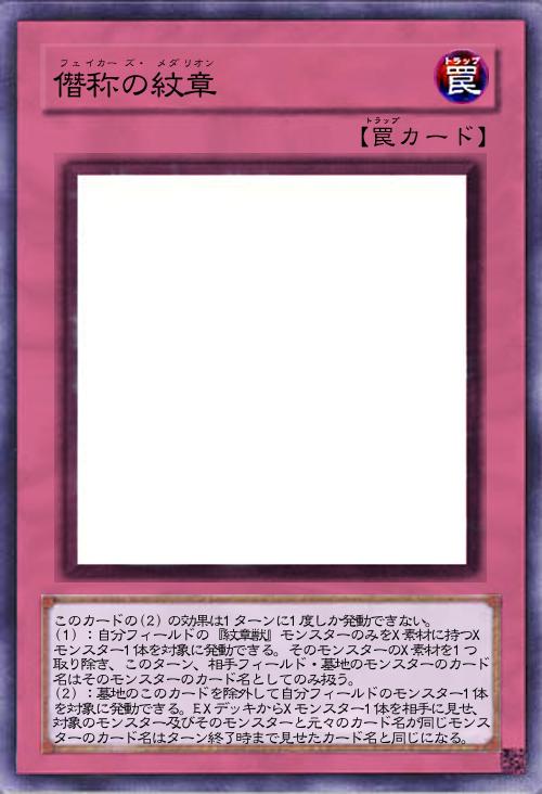 | このカードの(2)の効果は1ターンに1度しか発動できない。 (1):自分フィールドの『紋章獣』モンスターのみをX素材に持つXモンスター1体を対象に発動できる。そのモンスターのX素材を1つ取り除き、このターン、相手フィールド・墓地のモンスターのカード名はそのモンスターのカード名としてのみ扱う。 (2):墓地のこのカードを除外して自分フィールドのモンスター1体を対象に発動できる。EXデッキからXモンスター1体を相手に見せ、対象のモンスター及びそのモンスターと元々のカード名が同じモンスターのカード名はターン終了時まで見せたカード名と同じになる。 | |||