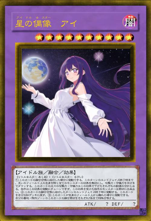 | 《リトル☆スター あくあ》+《リトル☆スター るびい》 ①:このカードの融合召喚に成功した場合に発動できる。このターンのエンドフェイズ終了時まで、互いのフィールド上の自身を除く全てのモンスターの効果を無効にし、攻撃力・守備力を半分までダウンする。このカードの元々の攻撃力・守備力はこの効果で下げたそれぞれの数値の合計となる。相手はこの効果の発動にチェーンできず、この効果を受けた相手のモンスターは素材に出来ない。②:このカードの融合召喚に成功したターンのエンドフェイズ終了時に発動する。このカードを自分のEXデッキに戻す。③:このカードが自身のフィールド上から離れた場合に発動できる。自分の墓地・除外ゾーンのこのカードの融合素材をそれぞれ1体まで特殊召喚する。 | |||