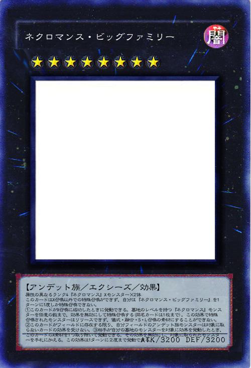 | 属性の異なるランク4『ネクロマンス』Xモンスター×2体 このカードはX召喚以外での特殊召喚ができず、自分は『ネクロマンス・ビッグファミリー』を1ターンに1度しか特殊召喚できない。 ①このカードがX召喚に成功したときに発動できる。墓地のレベルを持つ『ネクロマンス』モンスターを任意の数まで、効果を無効にして特殊召喚する(同名カードは1枚まで)。この効果で特殊召喚されたモンスターはリリースできず、儀式・融合・S・L召喚の素材にすることができない。②このカードがフィールドに存在する限り、自分フィールドのアンデット族モンスターは対象に取らないカードの効果を受けない。③相手が自分の墓地のモンスターを対象に効果を発動したとき、このカードのX素材を1つ取り除いて発動できる。その効果を無効にし、対象に取られたモンスターを手札に加える。この効果は1ターンに2度まで発動できる。 | |||