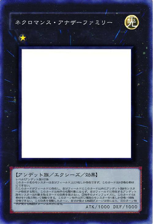 | レベル1アンデット族×2体 このカード名のモンスターは自分フィールド上に1枚しか存在できず、このカードはX召喚の素材にできない。 ①このカードがフィールドに存在し、自分フィールドにこのカード以外にアンデット族Xモンスターが存在する限り、このカードは相手の攻撃対象にならず、自分フィールドに存在するアンデット族モンスターは対象を取るカードの効果を受けない。②相手のメインフェイズに、このカードのX素材を1つ取り除いて発動できる。このターン相手は同じ種族のモンスターを1度しか召喚・特殊召喚できない。この効果を発動したターン、自分が受ける戦闘ダメージは倍になり、次のターン相手が受ける戦闘ダメージは半分になる。 | |||