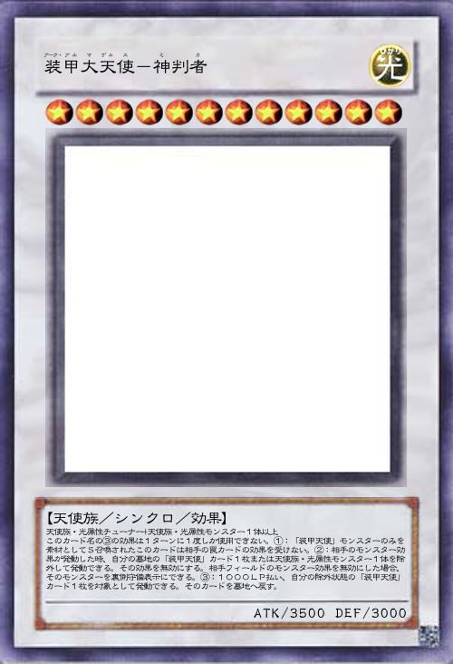 | 天使族・光属性チューナー+天使族・光属性モンスター1体以上 このカード名の③の効果は1ターンに1度しか使用できない。①:「装甲天使」モンスターのみを素材としてS召喚されたこのカードは相手の罠カードの効果を受けない。②:相手のモンスター効果が発動した時、自分の墓地の「装甲天使」カード1枚または天使族・光属性モンスター1体を除外して発動できる。その効果を無効にする。相手フィールドのモンスター効果を無効にした場合、そのモンスターを裏側守備表示にできる。③:1000LP払い、自分の除外状態の「装甲天使」カード1枚を対象として発動できる。そのカードを墓地へ戻す。 | |||
