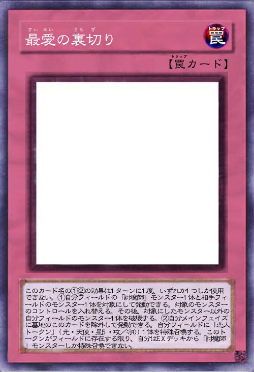 | このカード名の①②の効果は1ターンに1度、いずれか1つしか使用できない。①自分フィールドの「討魔師」モンスター1体と相手フィールドのモンスター1体を対象にして発動できる。対象のモンスターのコントロールを入れ替える。その後、対象にしたモンスター以外の自分フィールドのモンスター1体を破壊する。②自分メインフェイズに墓地のこのカードを除外して発動できる。自分フィールドに「恋人トークン」(光・天使・星5・攻/守0)1体を特殊召喚する。このトークンがフィールドに存在する限り、自分はEXデッキから「討魔師」モンスターしか特殊召喚できない。 | |||