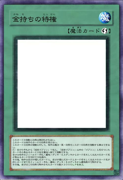 | このカードの発動と効果は無効化されない。 このカードは相手のカードの効果を受けない。 このカードの効果の発動に対して、相手は魔法・罠・効果モンスターの効果を発動する事はできない。 ①:自分の手札から「成金ゴブリン」1枚と、「成金ゴブリン」以外の「ゴブリン」と名のついたカード名の異なるカード2枚を墓地へ捨てて発動できる。 自分は相手のフィールド・手札・墓地・デッキ・EXデッキからカード名もしくは元々のカード名が異なるカードを合計で3枚選ぶ。 その後、相手は自分が選んだカードと、自分が選んだカードとカード名もしくは元々のカード名が同じカード全てをフィールド・手札・墓地・デッキ・EXデッキから裏側表示で除外する。 その後、自分はこの効果で除外されたカードの数×2000LPを失う。 | |||