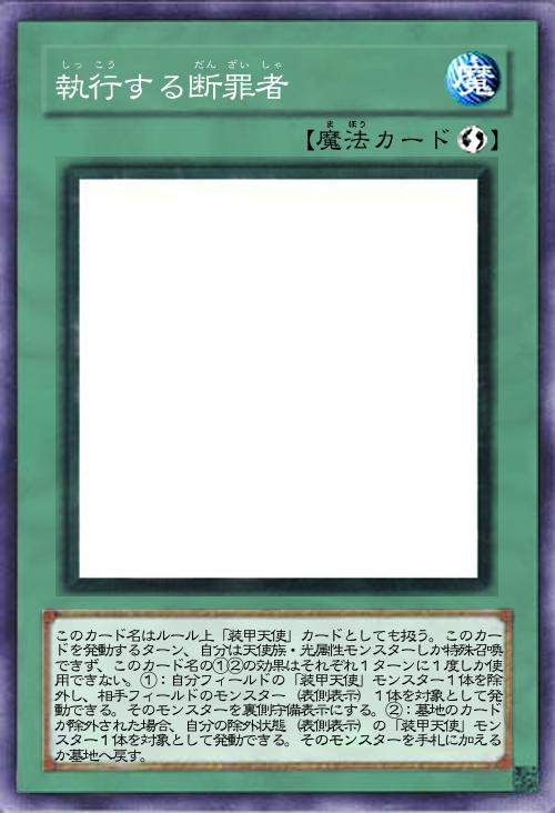 | このカード名はルール上「装甲天使」カードとしても扱う。このカードを発動するターン、自分は天使族・光属性モンスターしか特殊召喚できず、このカード名の①②の効果はそれぞれ1ターンに1度しか使用できない。①:自分フィールドの「装甲天使」モンスター1体を除外し、相手フィールドのモンスター(表側表示)1体を対象として発動できる。そのモンスターを裏側守備表示にする。②:墓地のカードが除外された場合、自分の除外状態(表側表示)の「装甲天使」モンスター1体を対象として発動できる。そのモンスターを手札に加えるか墓地へ戻す。 | |||
