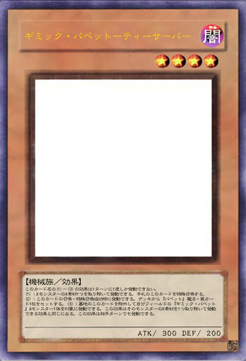 | このカード名の(1)~(3)の効果は1ターンに1度しか発動できない。 (1):XモンスターのX素材1つを取り除いて発動できる。手札のこのカードを特殊召喚する。 (2):このカードの召喚・特殊召喚成功時に発動できる。デッキから『パペット』魔法・罠カード1枚をセットする。(3):墓地のこのカードを除外して自分フィールドの『ギミック・パペット』Xモンスター1体を対象に発動できる。この効果はそのモンスターのX素材を1つ取り除いて発動できる効果と同じになる。この効果は相手ターンでも発動できる。 | |||