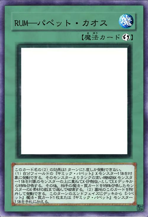 | このカード名の(2)の効果は1ターンに1度しか発動できない。 (1)自分フィールドの『ギミック・パペット』Xモンスター1体を対象に発動できる。そのモンスターよりランクの高い機械族Xモンスター1体を対象のモンスターの上に重ねてX召喚扱いとしてEXデッキから特殊召喚する。その後、相手の魔法・罠カードを特殊召喚したモンスターのX素材の数まで選んで破壊する。(2)墓地のこのカードを除外して発動できる。このターンのエンドフェイズにデッキから『パペット』魔法・罠カード1枚または『ギミック・パペット』モンスター1体を手札に加える。 | |||