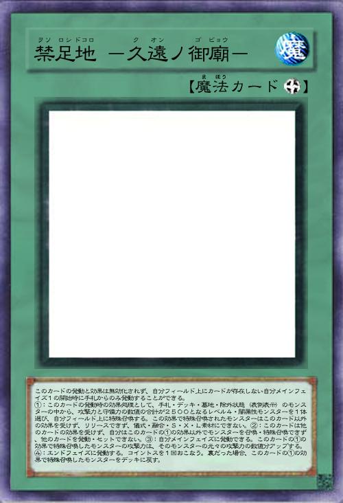 | このカードの発動と効果は無効化されず、自分フィールド上にカードが存在しない自分メインフェイズ1の開始時に手札からのみ発動することができる。 ①:このカードの発動時の効果処理として、手札・デッキ・墓地・除外状態(表側表示)のモンスターの中から、攻撃力と守備力の数値の合計が2500となるレベル4・闇属性モンスターを1体選び、自分フィールド上に特殊召喚する。この効果で特殊召喚されたモンスターはこのカード以外の効果を受けず、リリースできず、儀式・融合・S・X・L素材にできない。②:このカードは他のカードの効果を受けず、自分はこのカードの①の効果以外でモンスターを召喚・特殊召喚できず、他のカードを発動・セットできない。③:自分メインフェイズに発動できる。このカードの①の効果で特殊召喚したモンスターの攻撃力は、そのモンスターの元々の攻撃力の数値分アップする。④:エンドフェイズに発動する。コイントスを1回おこなう。裏だった場合、このカードの①の効果で特殊召喚したモンスターをデッキに戻す。 | |||