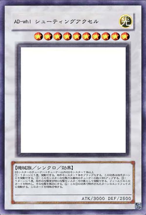 | Sモンスターのチューナー+チューナー以外のSモンスター1体以上 ①:1ターンに1度、発動できる。相手モンスター1体をブランク化する。この効果は相手ターンにも発動できる。②:このモンスターの攻撃力は墓地のチューナーの数×300アップする。③:1ターンに1度、相手の攻撃宣言時に攻撃モンスターを対象として発動できる。フィールドのこのカードを除外し、その攻撃を無効にする。④:この③の効果で除外されたターンのエンドフェイズに発動する。このカードを特殊召喚する。 | |||