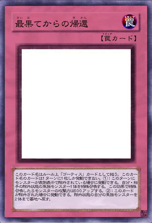| このカード名はルール上「ゴーティス」カードとして扱う。このカード名のカードは1ターンに1枚しか発動できない。①:このターンにモンスターが表側表示で除外されている場合に発動できる。自分・相手の除外状態の魚族モンスター1体を特殊召喚する。この効果で特殊召喚したSモンスターの攻撃力は500アップする。②:このカードが除外された場合に発動できる。除外状態の自分の魚族モンスターを2体まで墓地へ戻す。 | |||