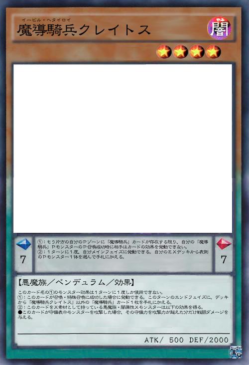 | このカード名の①のモンスター効果は1ターンに1度しか使用できない。 ①:このカードが召喚・特殊召喚に成功した場合に発動できる。このターンのエンドフェイズに、デッキから「魔導騎兵クレイトス」以外の「魔導騎兵」カード1枚を手札に加える。 ②:このカードをX素材として持っている悪魔族・闇属性Xモンスターは以下の効果を得る。 ●このカードが守備表示モンスターを攻撃した場合、その守備力を攻撃力が超えた分だけ戦闘ダメージを与える。 | |||