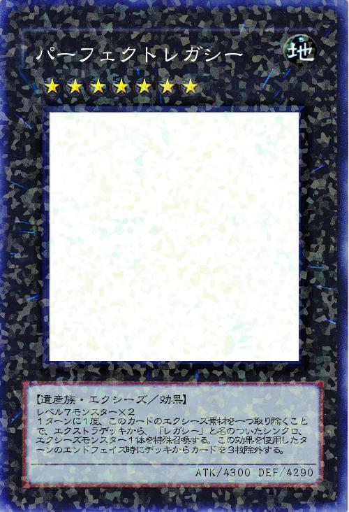 | レベル7モンスター×2 1ターンに1度、このカードのエクシーズ素材を一つ取り除くことで、エクストラデッキから、「レガシー」と名のついたシンクロ、エクシーズモンスター1体を特殊召喚する。この効果を使用したターンのエンドフェイズ時にデッキからカードを3枚除外する。 | |||