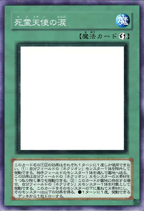 | このカード名の①②の効果はそれぞれ1ターンに1度しか使用できない。①:自分フィールドの「ネクリオン」モンスター1体を除外して発動できる。相手フィールドのモンスター1体を選んで墓地へ送る。この効果は自分フィールドの「ネクリオン」ⅩモンスターのⅩ素材を1つ取り除く事でも発動できる。②:このカードが墓地に存在する場合、自分フィールドの「ネクリオン」Ⅹモンスター1体を対象として発動できる。このカードをそのモンスターの下に重ねてⅩ素材にし、そのモンスターは以下の効果を得る。●1ターンに1度、発動できる。デッキから1枚ドローする。 | |||