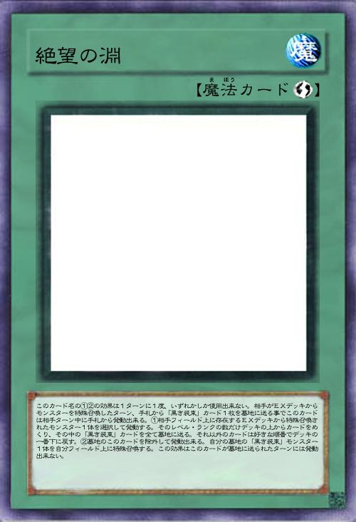| このカード名の①②の効果は1ターンに1度、いずれかしか使用出来ない。相手がEXデッキからモンスターを特殊召喚したターン、手札から「黒き装束」カード1枚を墓地に送る事でこのカードは相手ターン中に手札から発動出来る。①相手フィールド上に存在するEXデッキから特殊召喚されたモンスター1体を選択して発動する。そのレベル・ランクの数だけデッキの上からカードをめくり、その中の「黒き装束」カードを全て墓地に送る。それ以外のカードは好きな順番でデッキの一番下に戻す。②墓地のこのカードを除外して発動出来る。自分の墓地の「黒き装束」モンスター1体を自分フィールド上に特殊召喚する。この効果はこのカードが墓地に送られたターンには発動出来ない。 | |||