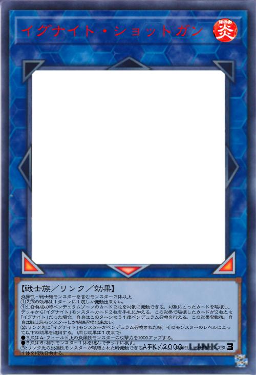 | 炎属性・戦士族モンスターを含むモンスター2体以上 ①②③の効果は1ターンに1度しか発動出来ない。 ①:L召喚成功時ペンデュラムゾーンのカード2枚を対象に発動できる。対象にとったカードを破壊し、デッキから「イグナイト」モンスターカード2枚を手札に加える。この効果で破壊したカードが2枚とも「イグナイト」だった場合、自身はこのターンもう1度ペンデュラム召喚を行える。この効果発動後、自身は戦士族モンスターしか特殊召喚出来ない。 ②:リンク先に「イグナイト」モンスターがペンデュラム召喚された時、そのモンスターのレベルによって以下の効果を適用する。(同じ効果は1度まで) ●3又は4:フィールド上の炎属性モンスターの攻撃力を1000アップする。 ●5又は6:相手モンスター1体を選んでデッキに戻す。 ③:リンク先の炎属性モンスターが破壊された時発動できる。デッキから、炎属性・戦士族モンスター1体を特殊召喚する。 | |||