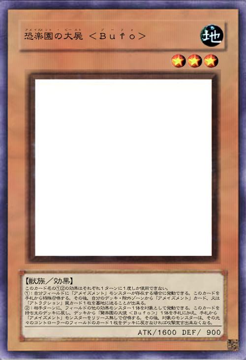 | このカード名の①②の効果はそれぞれ1ターンに1度しか使用できない。 ①:自分フィールドに「アメイズメント」モンスターが存在する場合に発動できる。このカードを手札から特殊召喚する。その後、自分のデッキ・除外ゾーンから「アメイズメント」カード、又は「アトラクション」罠カード1枚を墓地に送ることが出来る。 ②:相手ターンに、フィールドの他の効果モンスター1体を対象として発動できる。このカードを持ち主のデッキに戻し、デッキから「驚楽園の大使 <Bufo>」1体を手札に加え、手札から「アメイズメント」モンスターをリリース無しで召喚する。その後、対象のモンスターは、その元々のコントローラーのフィールドのカード1枚をデッキに戻さなければ攻撃宣言出来なくなる。 | |||