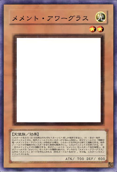 | このカード名の(1)(2)の効果はそれぞれ1ターンに1度しか使用できない。(1):自分・相手のメインフェイズに、相手フィールドにモンスターが2体以上存在し、自分フィールドに「冥骸合竜-メメントラル・テクトリカ」が存在する場合、このカードを手札から捨てて発動できる。相手フィールドの守備表示モンスターを全て表側攻撃表示にし、このメインフェイズを終了する。(2):自分メインフェイズに発動できる。自分フィールドの「メメント」モンスター1体を破壊し、自分フィールドの「メメント」モンスターの種類の数だけ、デッキから「メメント・アワーグラス」以外の「メメント」カードを手札に加える(同名カードは1枚まで)。その後、このターンのエンドフェイズになる。 | |||