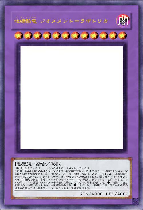 | 「地縛」融合モンスター+レベル8以上の「メメント」モンスター このカード名の③の効果は1ターンに1度しか使用できない。①:このカードは相手モンスター全てに1回ずつ攻撃できる。②:自分フィールドの「地縛」及び「メメント」モンスターと戦闘を行う相手モンスターは、ダメージステップ終了時まで効果が無効化される。③:自分・相手メインフェイズに発動できる。自分フィールドのモンスター1体を破壊し、デッキから1枚ドローする。この効果で以下の種類のモンスターを破壊した場合、それぞれの効果を適用する。●「地縛」:自分の墓地の「地縛」モンスター1体を特殊召喚する。●「メメント」:破壊したモンスターの攻撃力以上の攻撃力を持つ相手フィールドのモンスターを全て除外する。 | |||
