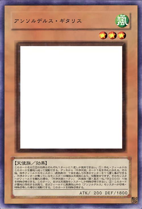 | このカード名の①②の効果はそれぞれ1ターンに1度しか使用できない。①:手札・フィールドのこのカードを墓地へ送って発動できる。デッキから「不浄天使」カード1枚を手札に加える。その後、相手フィールドのモンスター(表側表示)1体を選んで不浄カウンターを1つ置く事ができる。不浄カウンターが乗っているモンスターの種族は天使族になり、攻撃宣言できず、そのモンスターがフィールドを離れた場合、「不浄天使トークン」(天使族・闇・星8・攻/守2000)1体を特殊召喚できる。このターン、自分は天使族モンスターしか特殊召喚できない。②:このカードが墓地に存在する状態で、自分フィールドに風属性以外の「アンソルデルス」モンスターが召喚・特殊召喚した場合に発動できる。このカードを特殊召喚する。 | |||