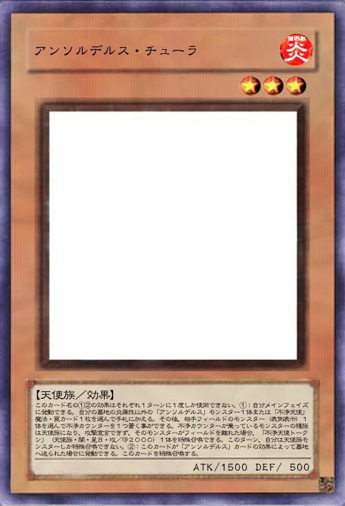| このカード名の①②の効果はそれぞれ1ターンに1度しか使用できない。①:自分メインフェイズに発動できる。自分の墓地の炎属性以外の「アンソルデルス」モンスター1体または「不浄天使」魔法・罠カード1枚を選んで手札に加える。その後、相手フィールドのモンスター(表側表示)1体を選んで不浄カウンターを1つ置く事ができる。不浄カウンターが乗っているモンスターの種族は天使族になり、攻撃宣言できず、そのモンスターがフィールドを離れた場合、「不浄天使トークン」(天使族・闇・星8・攻/守2000)1体を特殊召喚できる。このターン、自分は天使族モンスターしか特殊召喚できない。②:このカードが「アンソルデルス」カードの効果によって墓地へ送られた場合に発動できる。このカードを特殊召喚する。 | |||
