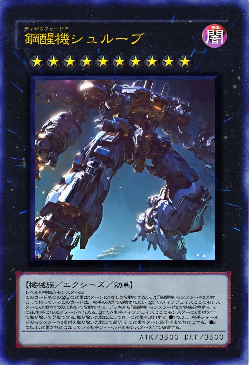 | レベル10機械族モンスターx2 このカード名のの②③の効果は1ターンに1度しか発動できない。①「鋼醒機」モンスターをX素材として持っているこのカードは、相手の効果で破壊されない。②自分メインフェイズにこのモンスターのX素材を1つ取り除いて発動できる。デッキから「鋼醒機」モンスター1体を特殊召喚する。その後、相手に1500ダメージを与える。③自分・相手メインフェイズにこのモンスターのX素材を全て取り除いて発動できる。取り除いた数に応じて以下の効果を適用する。●1つ以上:相手フィールドのモンスターをX素材を取り除いた数まで選び、その効果をターン終了時まで無効にする。●2つ以上:効果が無効になっている相手フィールドのモンスターを全て破壊する。 | |||