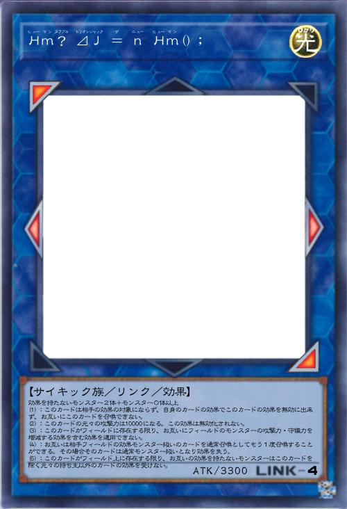 | 効果を持たないモンスター2体+モンスター0体以上 (1):このカードは相手の効果の対象にならず、自身のカードの効果でこのカードの効果を無効に出来ず、お互いにこのカードを召喚できない。 (2):このカードの元々の攻撃力は10000になる。この効果は無効化されない。 (3):このカードがフィールドに存在する限り、お互いにフィールドのモンスターの攻撃力・守備力を増減する効果を含む効果を適用できない。 (4):お互いは相手フィールドの効果モンスター扱いのカードを通常召喚としてもう1度召喚することができる。その場合そのカードは通常モンスター扱いとなり効果を失う。 (5):このカードがフィールド上に存在する限り、お互いの効果を持たないモンスターはこのカードを除く元々の持ち主以外のカードの効果を受けない。 | |||