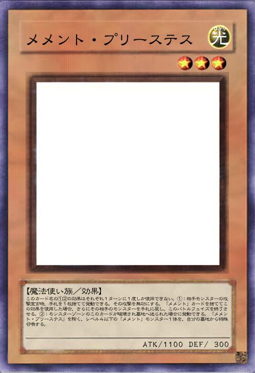 | このカード名の①②の効果はそれぞれ1ターンに1度しか使用できない。①:相手モンスターの攻撃宣言時、手札を1枚捨てて発動できる。その攻撃を無効にする。「メメント」カードを捨ててこの効果を使用した場合、さらにその相手のモンスターを手札に戻し、このバトルフェイズを終了させる。②:モンスターゾーンのこのカードが破壊され墓地へ送られた場合に発動できる。「メメント・プリーステス」を除く、レベル4以下の「メメント」モンスター1体を、自分の墓地から特殊召喚する。 | |||