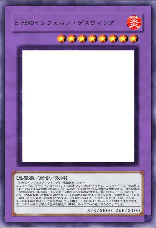 | 「E-HEROインフェルノ・ウィング」+悪魔族モンスター このカードは「ダーク・フュージョン」の効果でのみ特殊召喚できる。このカード名の①の効果は1ターンに1度しか使用できない。①:このカードが融合召喚した場合に発動できる。自分の墓地・除外状態から「E-HERO」モンスター2体を選んで特殊召喚する。②:相手フィールドのモンスター効果が発動した場合に発動できる。その効果を無効にしそのモンスターを破壊する。その後、破壊したモンスターの攻撃力分のダメージを相手に与える。このカードが「E-HERO」モンスターのみを融合素材として融合召喚している場合、この効果は1ターン中に2回まで使用できる。③:このカードの攻撃力は自分の墓地の「HERO」モンスターの数×300アップする。 | |||
